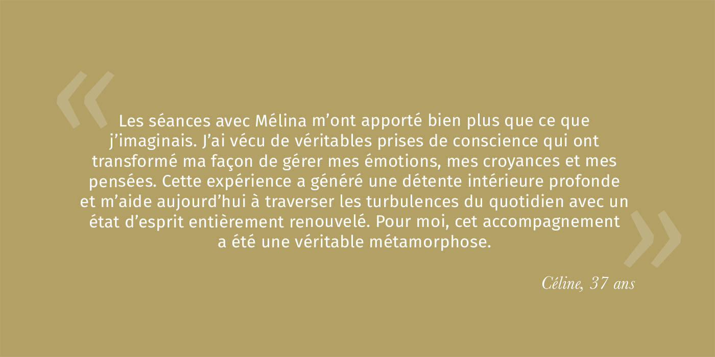 Je suis Mélina Jobin, sophrologue et thérapeute de parcours, et j’accompagne celles et ceux qui souhaitent retrouver leur boussole intérieure et vivre la sérénité dans leur quotidien.